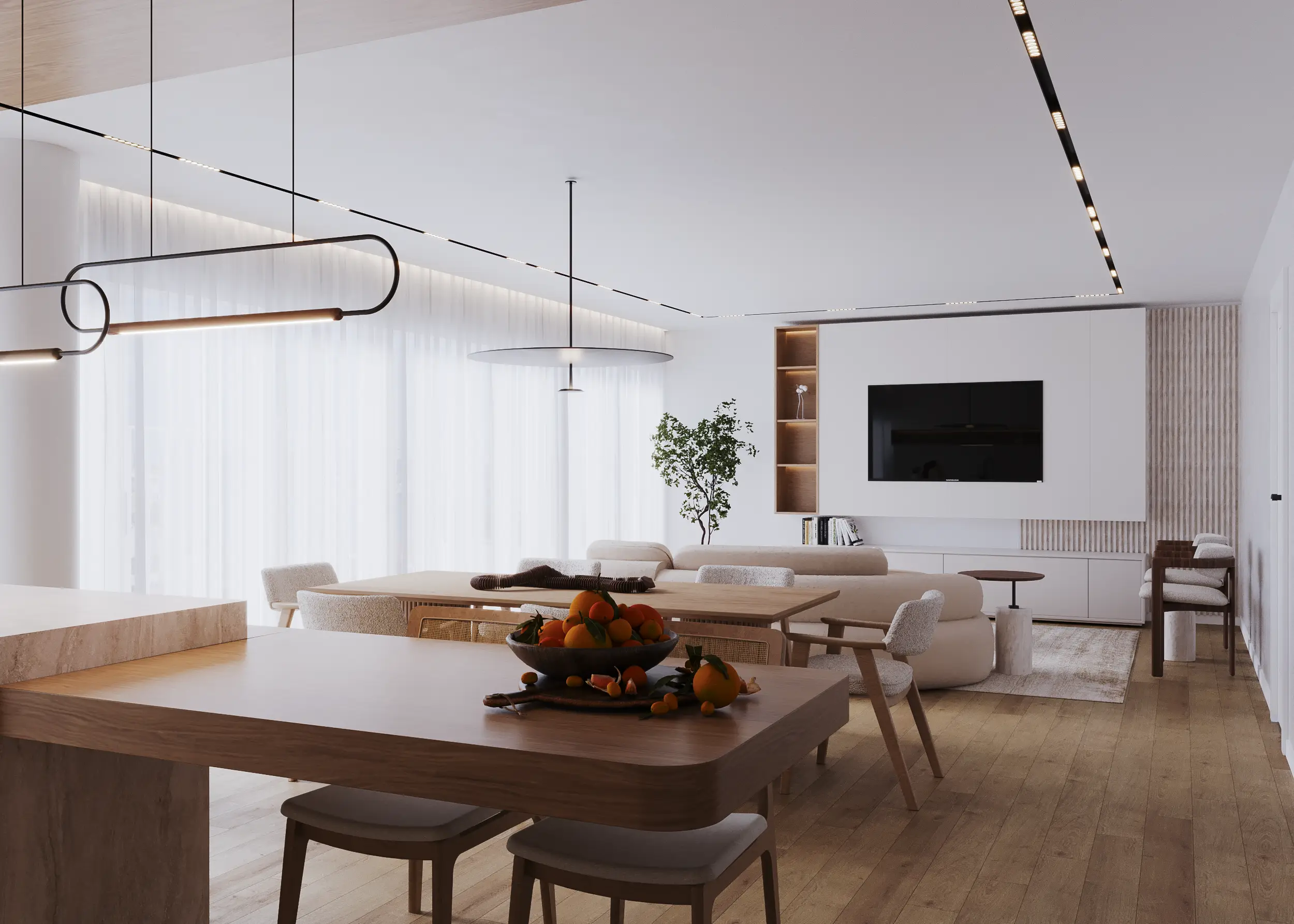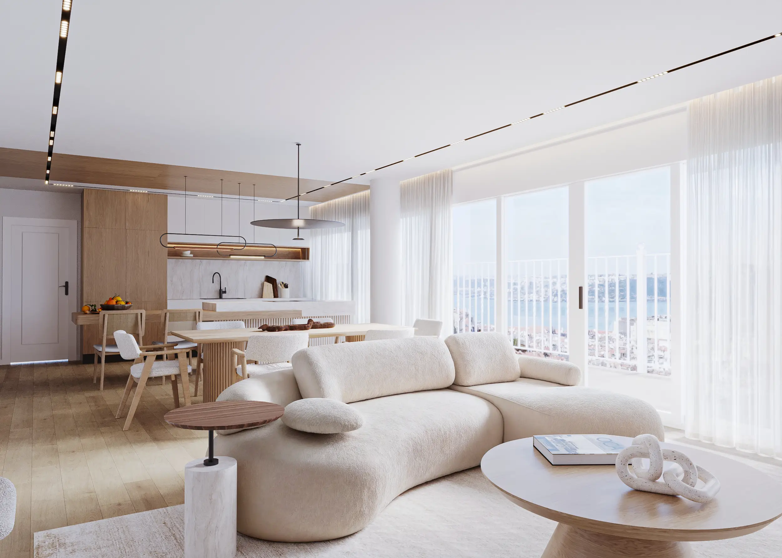 Optámos por uma base neutra, intencionalmente discreta, que valoriza a luz natural e permite que os espaços respirem. Texturas presentes e mobiliário pensado ao detalhe trazem calor e conforto, sem ofuscar a paisagem que se abre pelas janelas.