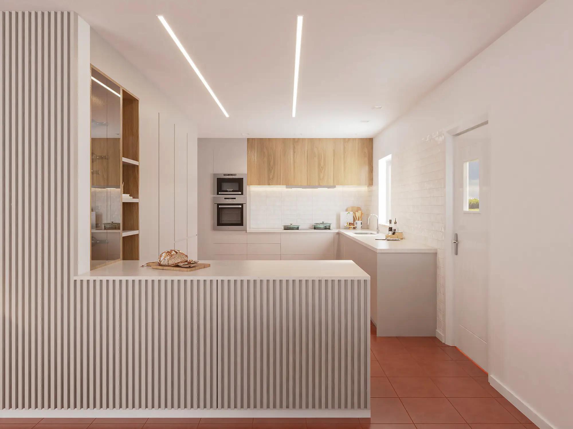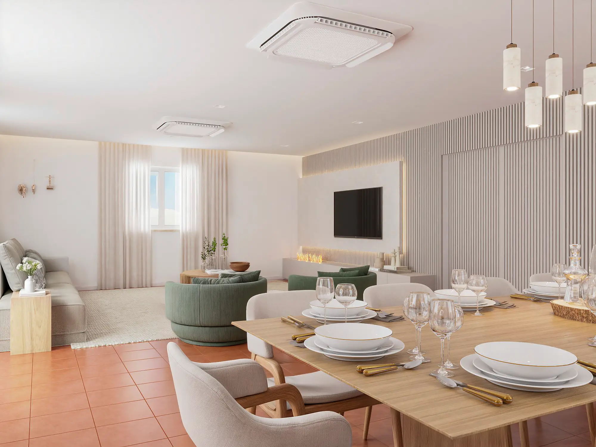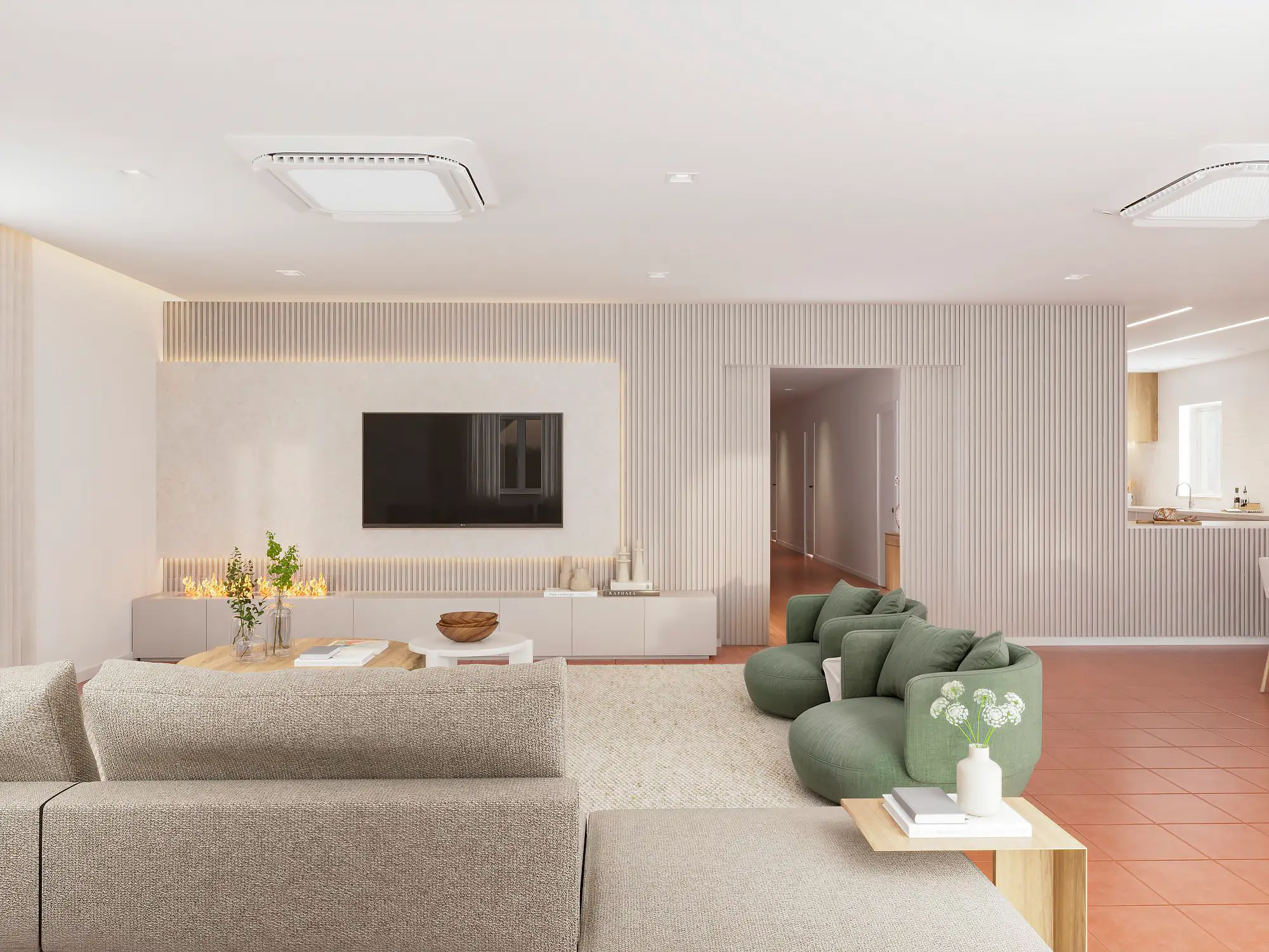 A sala integra diferentes zonas de estar, equilibrando linhas modernas com texturas naturais e uma paleta neutra pontuada por verdes suaves, que dialogam com a paisagem exterior. A cozinha foi concebida como coração da casa, unindo funcionalidade e design em soluções sob medida que privilegiam a partilha à mesa.