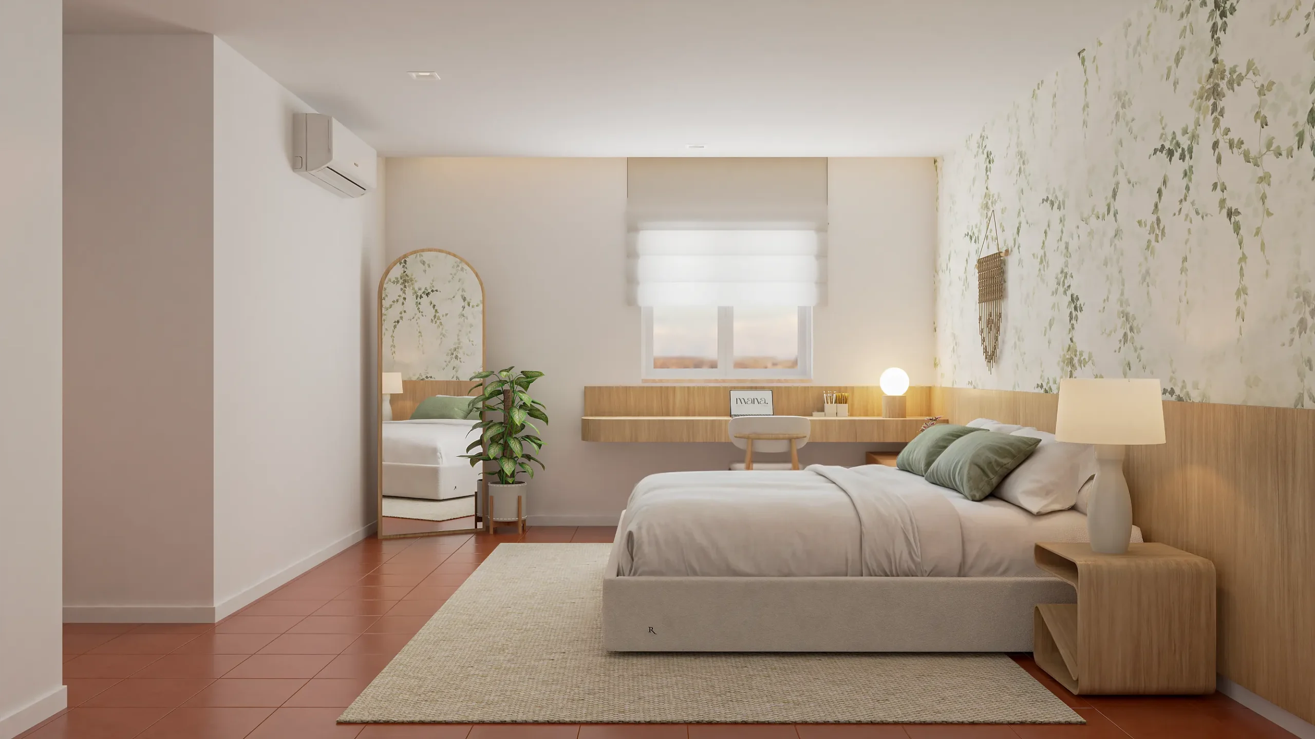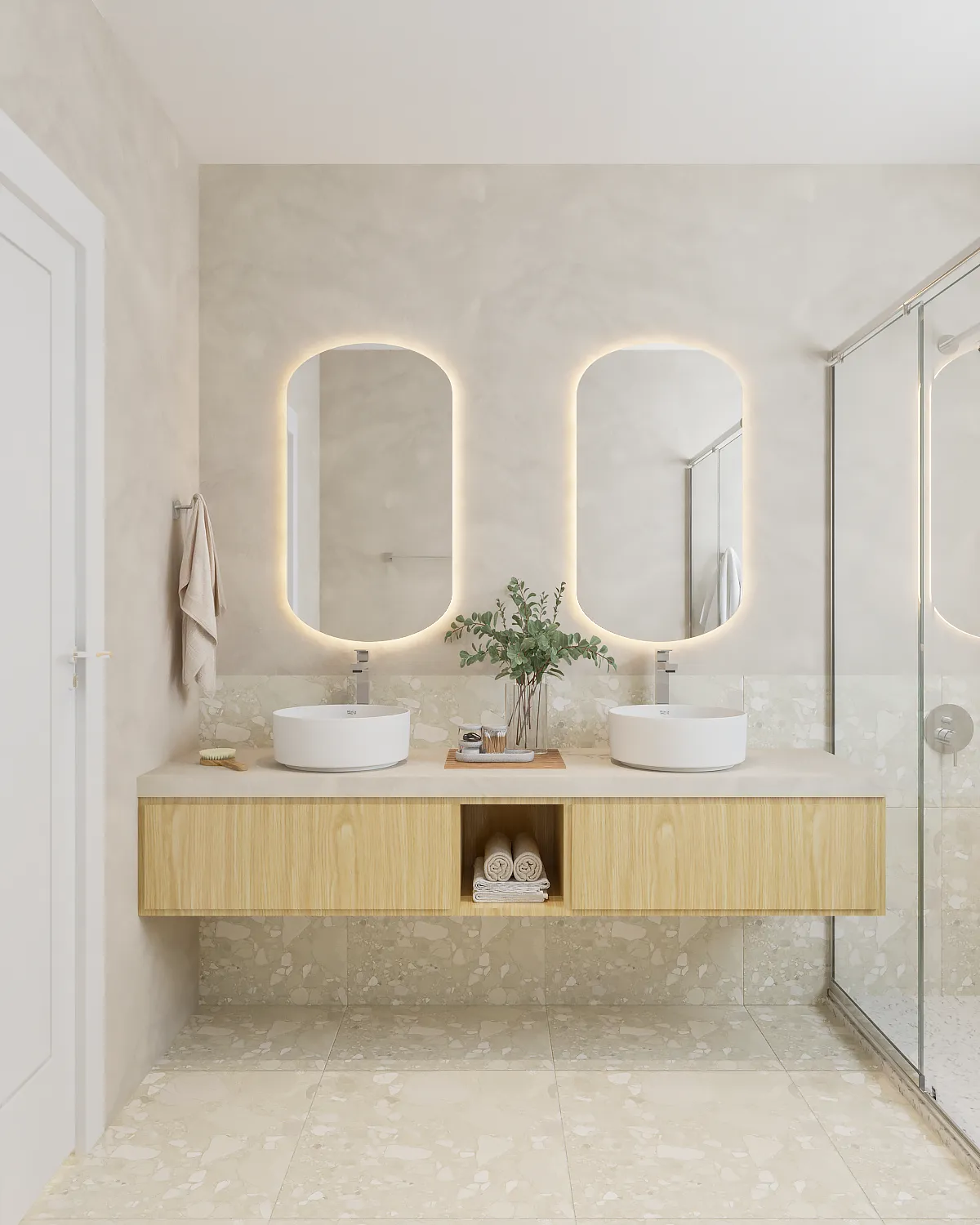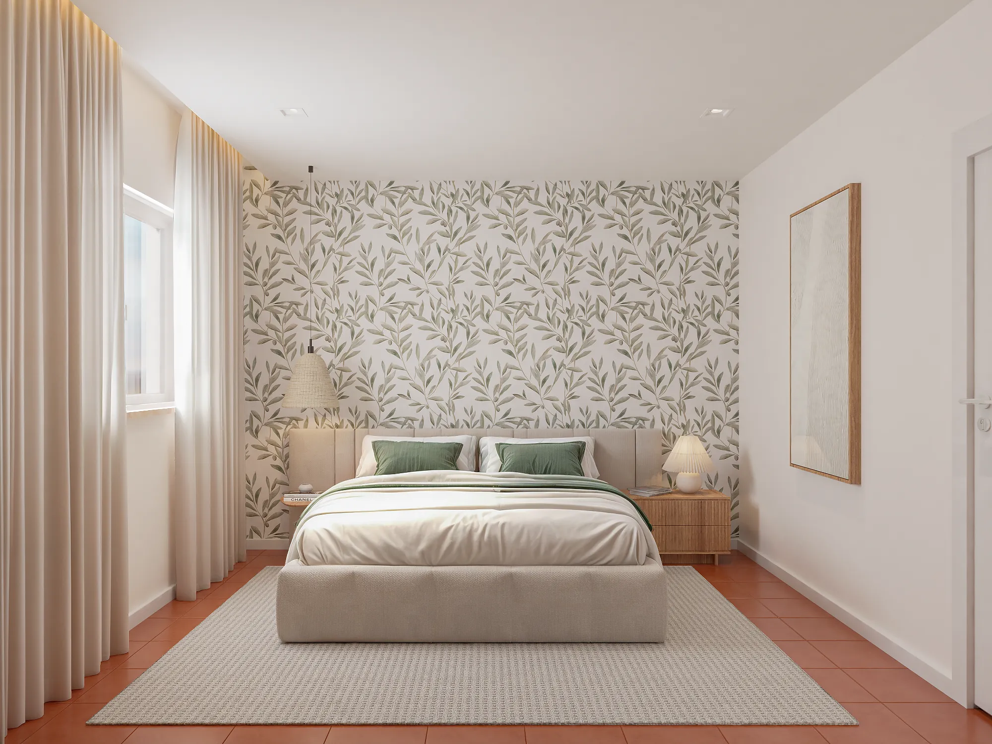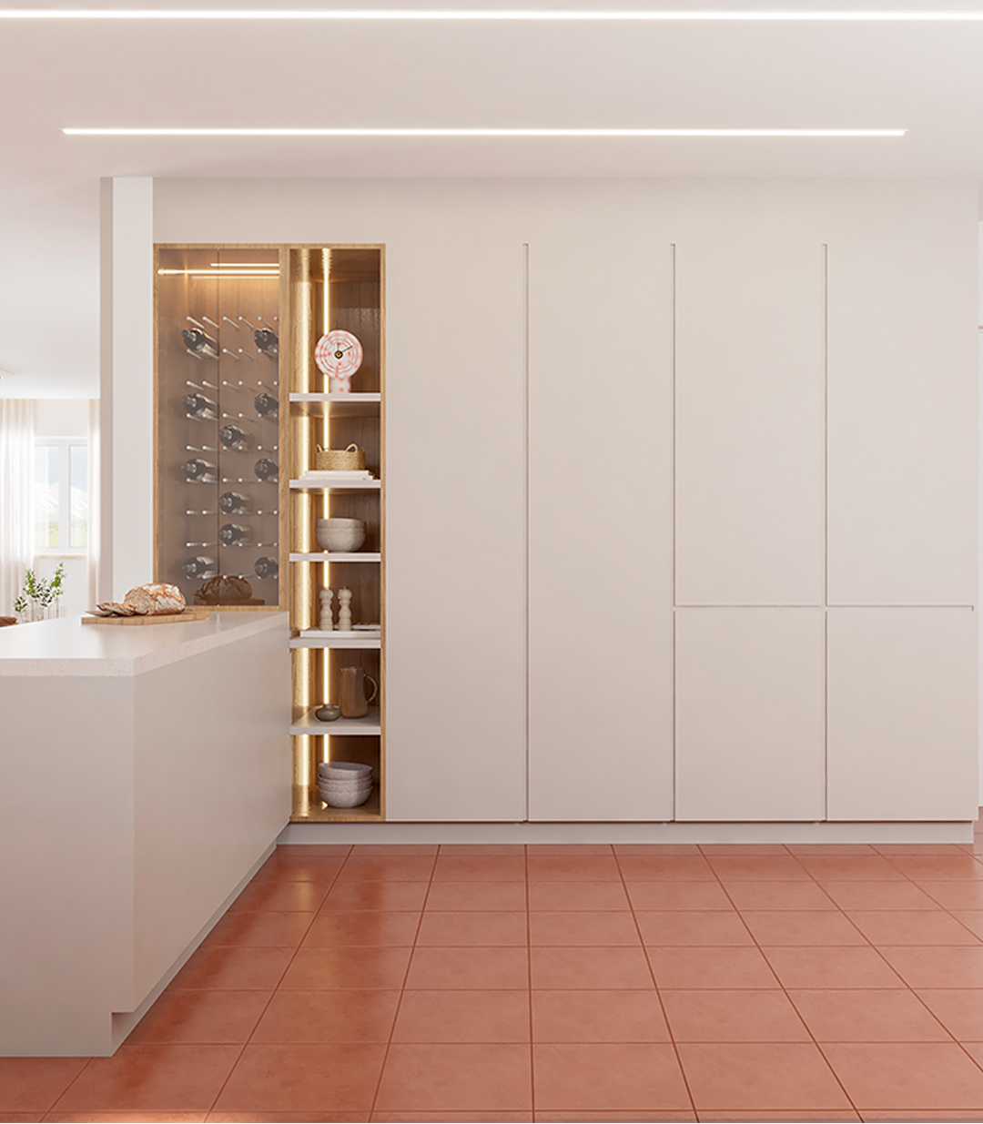 A sala integra diferentes zonas de estar, equilibrando linhas modernas com texturas naturais e uma paleta neutra pontuada por verdes suaves, que dialogam com a paisagem exterior. A cozinha foi concebida como coração da casa, unindo funcionalidade e design em soluções sob medida que privilegiam a partilha à mesa.
