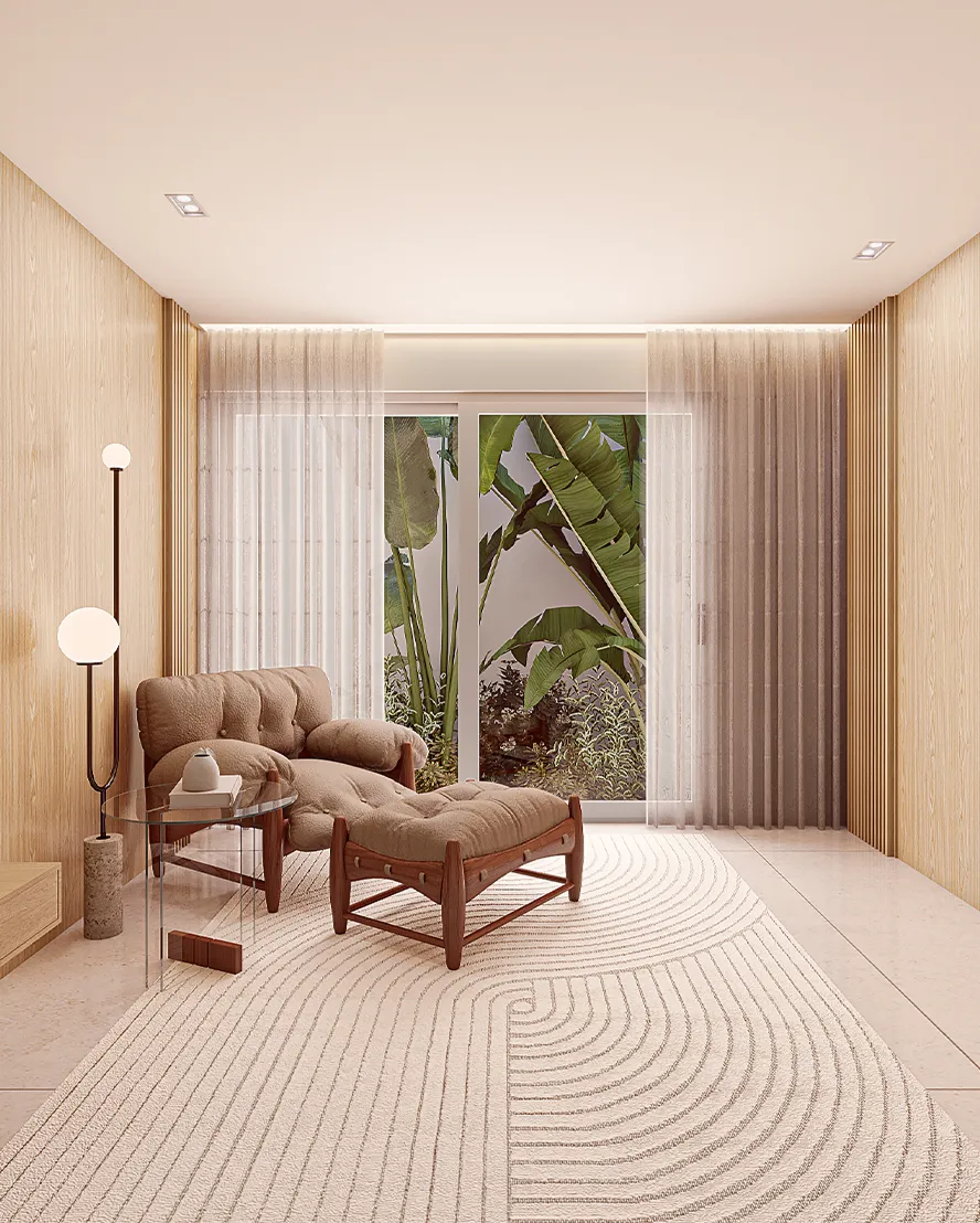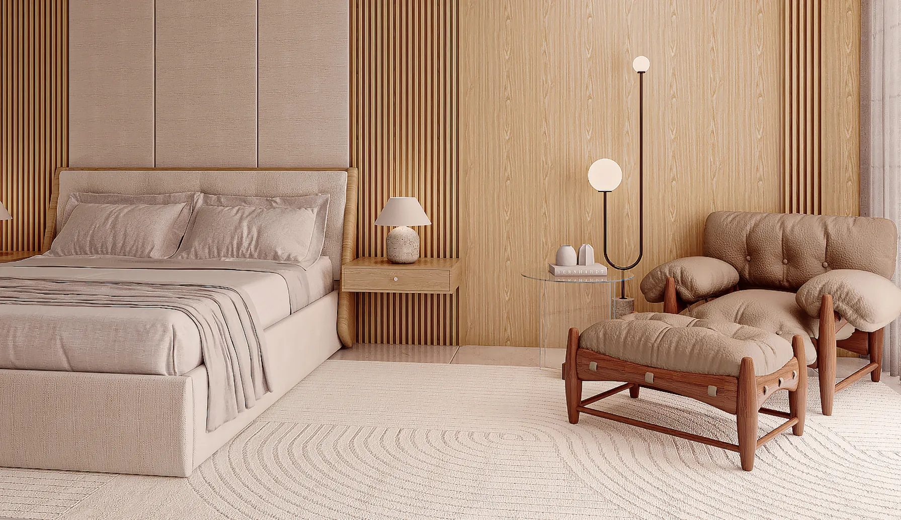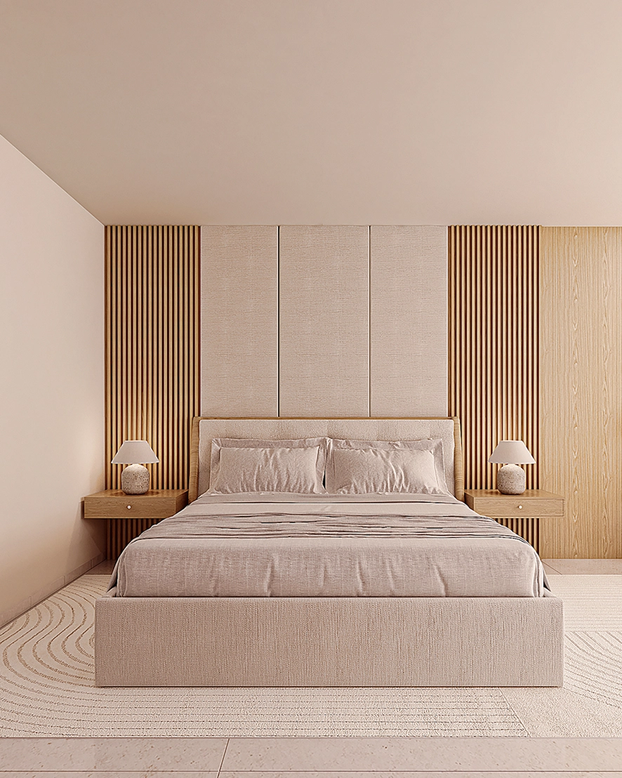 O resultado é um quarto que não é apenas lugar de dormir, é um refúgio para relaxar, ler, partilhar momentos a dois ou simplesmente parar e respirar. Um espaço que reflete cuidado, harmonia e respeita o ciclo circadiano.